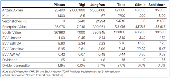 In der Studie kommen wir zum Schluss, dass die europaweit schwierige Währungs- und Wirtschaftslage die Pilatus-Bahnen AG bislang deutlich unterdurchschnittlich getroffen hat. Im Gegensatz zu den Bahnen Säntis, Rigi und Schilthorn weist die Pilatus-Bahnen AG die bessere Anlagequalität (höhere Ertragskraft, bessere Risikodiversifikation auf verschiedene Kundensegmente) auf. Lediglich bei der Dividende besteht Aufholbedarf (siehe Tabelle). Bei Kursen um 1’400 CHF sind die Aktien fair bewertet.