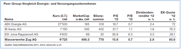 Bei Kursen um die 9’750 CHF ist die Aktie mit einem geschätzten Kurs-/Gewinn-Verhältnis für 2013 von 13.8 zwar kein Schnäppchen mehr, jedoch im Vergleich zu anderen Versorger-Titeln moderat bewertet (siehe Tabelle). Die Dividendenrendite beträgt 2.8%. Der hohe Abschlag zum Buchwert dürfte Kurssteigerungen bis in den Bereich des Eigenkapitals von etwa 13’000 CHF je Aktie rechtfertigen. Für Anleger mit mittel- bis langfristigem Zeithorizont ist der Wert ein solides, unterbewertetes Investment.
