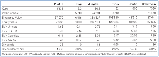Aufgrund der ersten Erfolge mit den neuen Erlebnisangeboten und der warmen Sommermonate im Juli und August erwarten wir für das laufende Geschäftsjahr einen Umsatzanstieg auf 23.65 Mio. CHF. Dieser liegt leicht über dem Fünf-Jahres-Durchschnitt von 23.49 Mio. CHF. Der Betriebsgewinn (EBITDA) dürfte auf 5.15 Mio. CHF steigen. Für die Schilthornbahn sind dies gute Werte. Verglichen mit den Top 3 besteht jedoch, insbesondere, was die EBITDA-Marge betrifft, noch Spielraum nach oben. Wir erachten daher die Aktie bei Kursen um die 1’060 CHF als fair bewertet. Interessant ist der Titel auf dem Niveau insbesondere wegen seiner Dividendenrendite, die mit 3.3% deutlich höher als diejenige der Vergleichsunternehmen ausfällt. Für den Privatanleger erfolgt die Ausschüttung verrechnungssteuer- und einkommenssteuerbefreit. Hinzu kommt pro Aktionär ein Gutschein für eine Gratisfahrt auf das Schilthorn. Dieser ist in der Woche der Generalversammlung einlösbar. Für den Aktionär mit einem Halbtaxabo entspricht der Gutschein einer geldwerten Leistung von 45 CHF.
