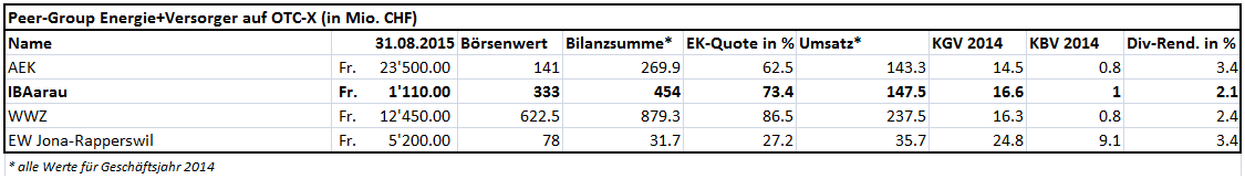 Wachstumstreiber für die IBAarau sind einerseits das starke Bevölkerungswachstum in der Region. Allein in den letzten fünf Jahren hat die Einwohnerzahl der Stadt Aarau um 26.5% auf 20’397 zugenommen. Andererseits entwickeln sich die übrigen Geschäftsfelder, insbesondere die Dienstleistungen der Elektro AG, erfreulich. In 2014 wuchs der Umsatz der Elektro AG um 8% auf 23.3 Mio. CHF. Insgesamt erscheinen daher die Wachstumsperspektiven der IBAarau AG intakt. Bei Kursen um die 1’110 CHF, die derzeit auf der Handelsplattform OTC-X für die Aktien gezahlt werden, ist die Aktie im Branchenvergleich insgesamt fair bewertet. Allerdings erscheint die Dividendenrendite mit rund 2% unterdurchschnittlich (siehe Tabelle). In der 2%igen Beteiligung an der börsenkotierten Alpiq AG sowie den betrieblichen und nicht-betriebsnotwendigen Liegenschaften dürften noch einige stille Reserven liegen. Daher ist die IBAarau-Aktie auf dem aktuellen Kursniveau insbesondere für langfristig orientierte Anleger als Ersatz für Obligationen interessant. Grosse Kurssprünge sind allerdings nicht zu erwarten.