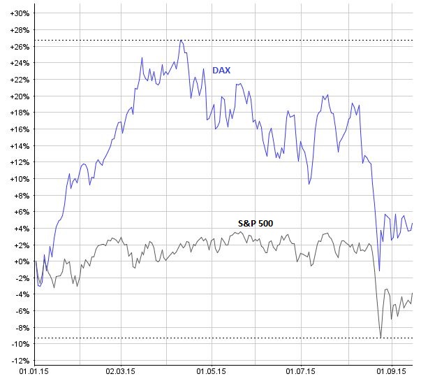 Neben dem DAX als Schrittmacher ist Ende 2014 auch plötzlich Shanghai auf die internationale Börsenbühne getreten. Mit einem furiosen Kursfeuerwerk, das den Shanghai Composite innerhalb von 9 Monaten um über 150% auf 5 178 Punkte klettern liess. Seit dem Hoch im Juni jedoch sind alle Dämme gebrochen. Ein Zusammenwirken von Wachstumsabschwächung, dem Platzen der Preisblase am völlig überhitzten Immobilienmarkt, zunehmenden Zahlungsausfällen auch bei Zins- und Tilgungszahlungen der häufig überschuldeten Unternehmen, einer Vielzahl von Betrugs- und Korruptionsfällen im Umfeld der Finanzwirtschaft, bei Staatsunternehmen und politischen Funktionären hatte eine rapide Trendwende am chinesischen Aktienmarkt eingeleitet. Wie die chinesische Regierung damit umging, spricht für sich.