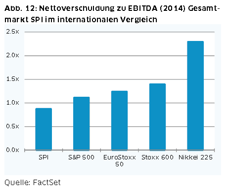 Obwohl die Schweizer Börse auch im internationalen Vergleich über die letzten Jahre eine imposante Entwicklung zeigt, sind die Aktien hier, im Gegensatz zu den meisten anderen Märkten, nicht überbewertet, weil die Entwicklung von Gewinnen und FCFs der SPI-Unternehmen eine solide Untermauerung bilden. Dies zeigt sich in dem Verhältnis von Verbindlichkeiten zu EBITDA in Abb. 12 der Studie. Und obwohl die Pay-out Ratio als Prozentsatz des FCF seit Jahren steigt, ist sie mit 55% durchaus noch steigerungsfähig.