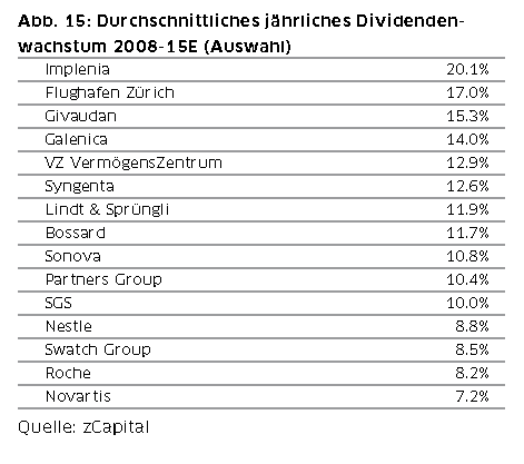 Die Dividendenstrategie mag vordergründig simpel erscheinen, im Grunde liegt aber der Analyse der Aktien genau das Zahlenwerk zugrunde, das bei jeder Analyse, ob qualitativ oder quantitativ, durchleuchtet wird. Die Autoren zeigen auf, dass die „Dow-Dogs“ Strategie insofern zu kurz greift, als nur die Zahlen der Vergangenheit in die Entscheidungsfindung Eingang finden. Die Dow-Dogs sind diejenigen Aktien mit der höchsten Dividendenrendite und werden bei der Strategie einfach zum Ende jeden Jahres entsprechend im Portfolio ausgetauscht. Diese Strategie hat sich über die Jahrzehnte zwar als weit besser als viele andere erwiesen, berücksichtigt aber nicht, dass hohe Dividendenrenditen in Folge einer schwachen Aktienperformance auch ein Warnsignal sein können für anstehende Dividendenkürzungen oder gar -streichungen, die wiederum oft Anlass für weitere Kursabstürze der Aktie sind. Eine weiter entwickelte Strategie ist „Dividend Value“, wobei der Schwerpunkt der Betrachtung auf die Kontinuität der Dividendenzahlung gelegt wird. Die dritte Dividendenstrategie ist „Dividend Growth“. (Abb. 15) Nestlé mit einer über 50-jährigen Historie von nie gekürzten Dividendenzahlungen ist hier der leuchtende Stern an der Schweizer Börse. Seit 2008 stieg die Dividende bei Nestlé um durchschnittlich 8,8% p.a..