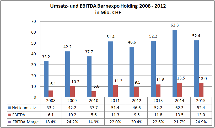Der Berner Messeveranstalter Bernexpo Groupe berichtete am 31.3. von einem erfreulichen Geschäftsjahr 2015. So konnte bei einem Umsatz von 52.4 Mio. CHF ein operatives Ergebnis (EBITDA) von 13.0 Mio. CHF sowie ein Betriebsergebnis (EBIT) von 6.3 Mio. CHF erzielt werden. Nach Angaben der Gesellschaft gelang es durch konsequentes Kostenmanagement, den Betriebsaufwand um 1 Mio. CHF zu senken. Unter dem Strich verlieb ein Konzerngewinn von 4.0 Mio. CHF. Die höhere Profitabilität der Gruppe zeigt sich auch in einer deutlichen Verbesserung der Marge: Die EBITDA-Marge erreichte mit 24.9% einen Rekordwert. 2014 lag sie noch bei 21.7%. Weiterhin gab die Gesellschaft bekannt, für 2015 eine konstante Dividende von 15 CHF je Aktie ausschütten zu wollen.