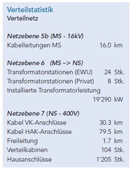 Das abgelaufene Geschäftsjahr 2015 (Geschäftsbericht 2015) war damit bereits das 110. Geschäftsjahr der Gesellschaft – und es war erneut, trotz eines unverändert schwierigen und regulatorisch anspruchsvollen Marktumfelds für Energiewerte, unter dem Strich ein erfolgreiches Jahr. Der Betriebsertrag war 2015 um etwa 3.3% auf knapp 8.1 Mio. CHF rückläufig. Der überwiegende Teil des Ertrags resultierte aus Entgelten für die Netznutzung und machte stabile 3.4 Mio. CHF oder knapp 43% des gesamten Betriebsertrags aus (Vj. 41.5%). Der Energieertrag innerhalb des Betriebsertrags war dagegen um 8.2% auf etwas weniger als 2.2 Mio. CHF rückläufig. Der Dienstleistungsertrag schmälerte sich in einem „hart umkämpften Markt“ (EWU) um fast 7.5% auf 1.75 Mio. CHF. Wie schon in den Vorjahren investierte das EWU zur Aufrechterhaltung der Versorgungssicherheit mehr als 1 Mio. CHF in das Verteilnetz (Verteilnetzstatistik: siehe Abbildung).