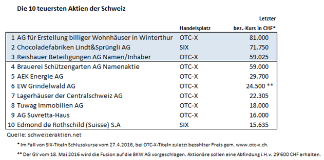 Sie ist mittlerweile, noch vor der berühmten „Schoggikoffer-Aktie“ der Chocoladefabriken Lindt & Sprüngli AG, die mit Abstand teuerste Aktie der Schweiz, wohl auch eine der teuersten Aktien der Welt und dennoch weitgehend unbekannt: die bereits 1872 in einer Vorgängergesellschaft gegründete Aktiengesellschaft für Erstellung billiger Wohnhäuser in Winterthur ist in vieler Hinsicht eine OTC-Kuriosität und auch ein Unikum (siehe auch Blog-Beitrag vom 29. April 2015). Nicht nur, dass die Gesellschaft über keine eigene Homepage verfügt. Auch über ihre Strukturen im Aktionariat ist über Marktgerüchte hinaus öffentlich wenig bekannt. Bekannt ist, dass das Aktienkapital von 600’000 CHF in lediglich 1’200 Aktien à 500 CHF nominal eingeteilt ist. Innerhalb des Streubesitzes ist die nur selten gehandelte, sehr „schwere“ Aktie aus ihrer Historie im lokalen Winterthurer Umfeld in festen Händen, oft über Generationen hinweg.