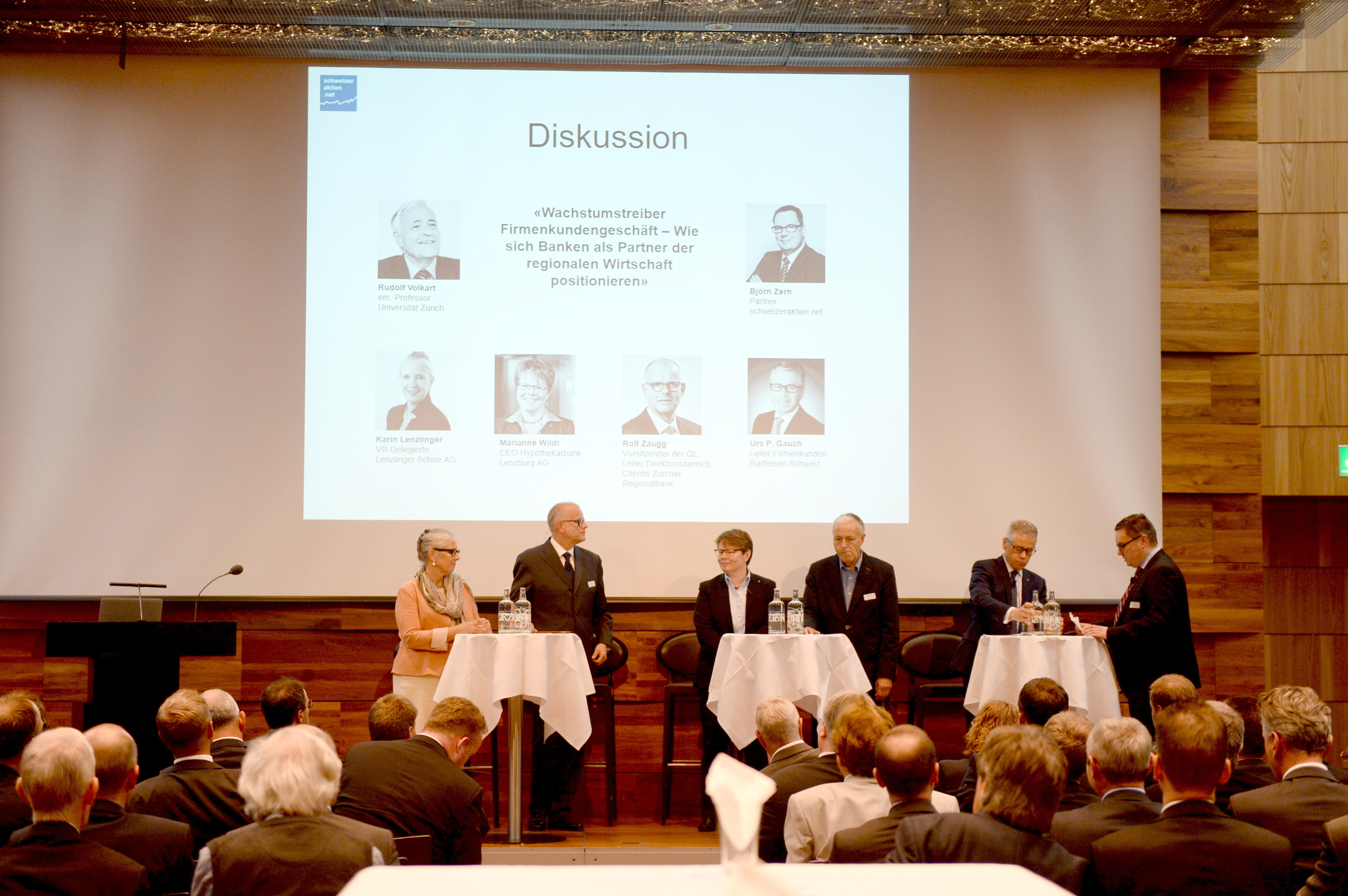 Während der anschliessenden Diskussion mit Prof. em. Rudolf Volkart und Dr. Karin Lenzlinger wurden fünf Thesen zum Firmenkundengeschäft diskutiert.
