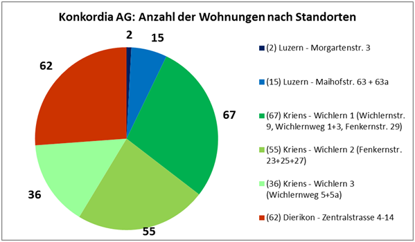 Insgesamt verwaltete die Konkordia AG zum Bilanzstichtag 31. Dezember 2015 237 Wohn- und 17 Gewerbeeinheiten sowie mehrere hundert Parkplätze/Garagen/Einstellhallenplätze in eigenen Liegenschaften. Die Verteilung der Wohnungen auf die einzelnen Standorte ist dabei wie folgt: