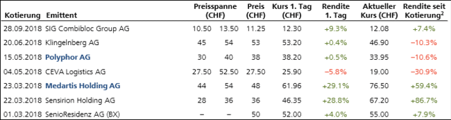 Mit Blick nach vorn werden als glaubwürdige Börsenkandidaten angeführt: die Life Sciences Unternehmen Medacta und Implantica. Weiterhin prüfe die Swiss Re den Börsengang einer Tochter. Fundamenta plane einen Wechsel an die SIX und eine Kapitalerhöhung. Bereits bekannt sind die Börsenpläne von Selecta und die zu erwartende Abspaltung von Alcon durch Novartis. Es bleibt also spannend bei den IPOs in der Schweiz. Stand heute sind zwar drei Aktien des Jahrgangs 2018 aktuell im Minus, doch sowohl Sensirion als auch Medartis weisen aussergewöhnlich hohe Kursgewinne auf.
