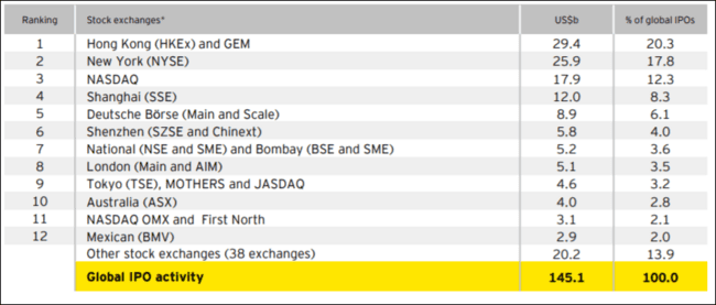 Allein 6.9 Mrd. USD entfielen auf China Tower Corp., weitere 5.4 Mrd. USD auf Xiaomi Corp. Beide sind Telekommunikationsunternehmen aus China. Zum Vergleich: An der NYSE fanden 10 IPOs statt, die 6.1 Mrd. USD einbrachten, an der Nasdaq waren es 37 IPOs und 5.8 Mrd. USD Emissionserträge. Dies genügte für Rang 2 und Rang 3 im Ranking der internationalen Börsen nach Hongkong.