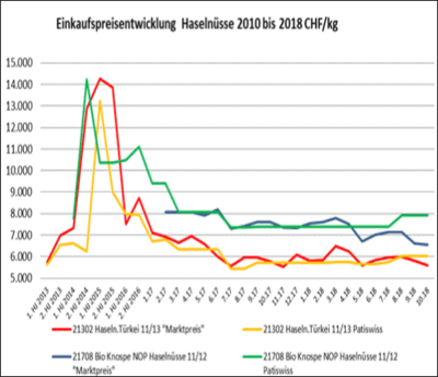 Die Trends aus 2017 setzten sich zum Teil auch 2018 fort. Die Preise der Rohwaren entwickelten sich seit der Ernte im Herbst 2017 schwach, so dass 2018 weitere Preiszugeständnisse an die Kunden gemacht werden mussten. Während bei Haselnüssen der Angebotsüberhang erst 2019 abgebaut sein dürfte, haben sich die Mandelpreise zuletzt erholt. Die Gesellschaft führt dies auf die funktionierende Marktwirtschaft in den USA zurück, wo in Kalifornien der Grossteil der globalen Mandelernte eingefahren wird. Im Gegensatz dazu werde der Haselnussmarkt im Haupternteland Türkei durch Markteingriffe staatlicher Stellen verzerrt. Patiswiss sieht in der wachsenden Rolle von Georgien und Aserbaidschan als Anbauland bessere Einkaufsbedingungen in der Zukunft.