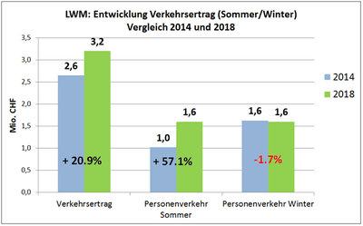Im Jahr 2014 machte der Verkehrsertrag im Sommer mit etwas mehr als 1 Mio. CHF nur etwa 38.5% des Gesamtertrags aus (Geschäftsbericht 2014, S. 10). Seither konnte der Sommerertrag innerhalb von nur 4 Jahren um fast 0.6 Mio. CHF oder knapp 60% auf die bereits erwähnten 1.6 Mio. CHF gesteigert werden. Alleine im Jahr 2018 lag der Zuwachs bei 0.26 Mio. CHF oder fast +20% im Vergleich zum Vorjahr. Realistischerweise profitierte die LWM dabei – neben den neuen, attraktiven Angeboten seit der Sommersaison 2018 – aber auch von den in der Jungfrau-Region insgesamt steigenden Touristenzahlen, getrieben von den sommerlastigen Fernmärkten.