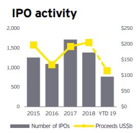 Trotz der rückläufigen Tendenz hat sich das IPO-Klima nicht eingetrübt. Der weiterhin starke Appetit der Anleger auf neue Aktien zeigt sich in den hohen Renditen für Erstzeichner. Die durchschnittliche Performance der IPOs am ersten Handelstag lag bei beachtlichen 27%, die Aftermarket-Performance stieg ebenfalls weiter auf 32% an. Die Fachleute von Ernst & Young erwarten daher in ihrem IPO-Report zum dritten Quartal 2019, dass die Qualitätsunternehmen mit der Umsetzung ihrer IPO-Plänen warten, bis sich die aktuellen Störfeuer gelegt haben, darunter die Brexit-Thematik, die Ende Oktober einen Scheidepunkt erreicht, und der Handelskonflikt USA-China. Eine Belebung der Primärmarktaktivität wird im ersten Halbjahr 2020 erwartet – vor den Wahlen in den USA im November 2020.