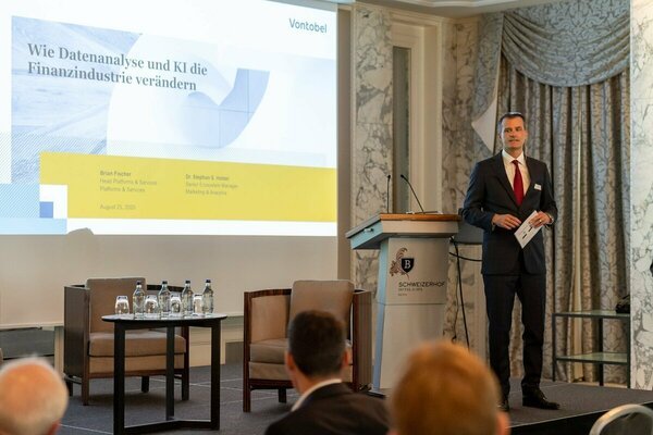 Honegger von der Bâloise hatte Künstliche Intellgenz (KI) angesprochen, die Bank Vontobel nutzt sie und möchte mit ihrer Unterstützung in Zukunft die Kundendaten analysieren. Aber dazu braucht sie Daten, Daten, Daten. Und die hat jede Bank für sich. Und will und darf sie auch nicht teilen. Deshalb plant die Bank Vontobel den Aufbau einer Plattform, die die Berechnung der Daten zu den einzelnen Banken bringt. Die Vontobel-Exponenten Brian Fischer und Stephan Holzer möchten, dass die Banken auf dem heruntergeladenen Modell ihre KI trainieren und sie dann auf die Plattform hochladen, wo Vontobel ein sogenanntes Super-KI erstellt, das sie wiederum den Banken zur Verfügung stellt. Eine Case-Study der Zukunft mit der ungewissen Aussicht, ob die eher pro domo orientierten Banken diese Plattform auch nutzen werden.
