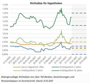 Für 2022 dürften die Hypothekenzinsen in der Schweiz weiter volatil bleiben, allzu grosse Ausschläge nach oben sind jedoch derzeit nicht zu erwarten. Die Nachfrage am Immobilienmarkt dürfte sich zudem weiter robust entwickeln. Die Preissteigerungen für privates Wohneigentum betrug im vergangenen Jahr 6.2% in der Schweiz. Diese Preissteigerungen sind vor allem für Neukunden ein Problem, die sich den Traum vom Eigenheim erfüllen wollen. Die Hürden für eine Finanzierung werden dadurch höher, zumal die Banken für die Berechnung der Tragbarkeit oft einen kalkulatorischen Zinssatz zwischen 4,5% und 5% anwenden, auch wenn der Hypothekenzins für zehn Jahre seit längerem unter 1% notiert. Ausserdem waren die Banken bei den Belehnungswerten für neue Hypothekarkredite schon im abgelaufenen Jahr wieder sehr zurückhaltend. Selbst wenn Belehnungen für selbstgenutztes Wohneigentum von bis zu 80% möglich wären, begrenzten die Banken die Belehnung in den meisten Fällen auf 68%. In Q3 2021 vergaben Schweizer Banken knapp 16’000 neue Kredite für selbstgenutztes Wohneigentum.