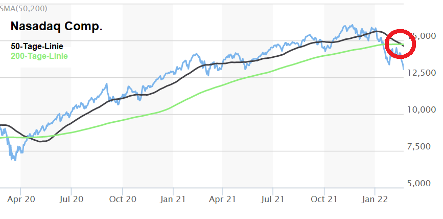 Die drei genannten Aktien sind mit den drastischen Kursrückgängen nicht allein, bilden aber besonders eindrücklich den Prozess des Übergangs von Euphorie zu Ernüchterung ab, von dem viele weitere sogenannte Wachstumsaktien betroffen sind. Die kollektive „Market Cap lost“ von Netflix, Paypal und Meta summiert sich fast auf 1 Bio. USD! Bei manchen Tech-Titeln belaufen sich die Verluste sogar auf bis zu 80%! Wachstums-Aktien finden sich naturgemäss vor allem an der Wachstums-Börse Nasdaq. Der Leit-Index der Aktien-Hausse seit 2009, der Nasdaq Composite Index, zeigt nach einer Verzehnfachung seit der Finanzkrise aktuell ein seltenes „Death Cross“. Die gleitenden Durchschnittlinien von 50 und 200 Tagen schneiden sich von oben nach unten. Das heisst, dass sowohl der kurzfristige als auch der langfristige Trend die Richtung geändert haben. Es gilt als schlechtes Omen, weil es meistens, wenn auch nicht immer, eine Baisse von einiger Dauer anzeigt.
