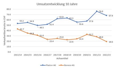 Im Gegenzug entwickelten sich die Umsätze bei der Plaston AG. welche die Sparte mit den Kunststoffteilen und –verpackungen umfasst, positiv. Binnen zehn Jahren hat die Plaston AG den Umsatz von 53.2 Mio. CHF auf zuletzt 67.9 Mio. CHF gesteigert: ein Plus in diesem Zeitraum von fast 28%! Bei Boneco sieht es anders aus: Hier gingen die Umsätze von 42.7 Mio. CHF auf nur noch 19.0 Mio. CHF zurück: minus 55%.