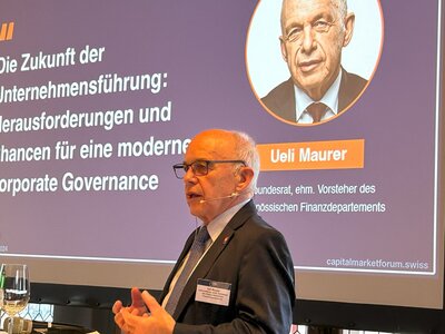 Was zeichnet eine gute Unternehmensführung aus? Dieser Frage widmete sich am diesjährigen Swiss Capitalmarket Forum in Zürich kein geringerer als Ueli Maurer, der bis Ende Dezember 2022 Mitglied des Bundesrates war. «Vertrauen ist zentral», so der SVP-Magistrat. Eine gute Führung zeichne sich durch das Vertrauen aus, das die Kunden in ein Unternehmen hätten. Ebenso müssten Führungskräfte und Mitarbeitende einander vertrauen können. Als weitere Grundsätze nannte Maurer auch das aus der Armeeführung stammende «Kommandieren, kontrollieren, korrigieren». Es brauche klare Ziele und keine langen Diskussionen. Wenn man nicht entscheide, werde viel Bürokratie aufgebaut, so der frühere Chef des VBS (2009 bis 2015).