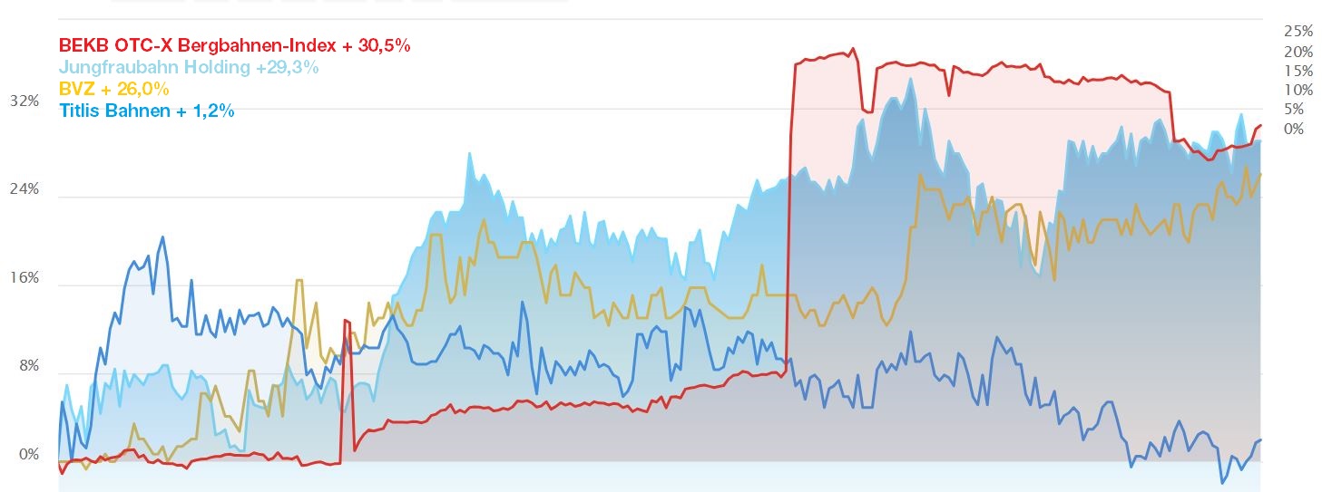 Ein Spiegel des erfolgreichen Schaffens am Berg sind die Aktienkurse, die in vielen Fällen markante Steigerungen zu verzeichnen hatten. Ob die an der SIX kotierten grossen drei, die Jungfraubahn, die Titlisbahn und die BVZ Holding, oder die zahlreichen kleineren Unternehmen, die auf OTC-X der BEKB gelistet sind, viele haben das fortgesetzte Vertrauen der Investoren, die den weltweiten Tourismus weiter wachsen sehen.