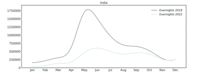 In den letzten 10 Jahren (2014 verglichen mit 2023) sind die Logiernächte (LN) aus dem Markt Indien um 24,3% gewachsen. Vergleicht man die Jahre 2010 mit 2019 (Vorpandemieniveau), wuchs der Markt Indien sogar um 101,8% LN. Allerdings liegt er immer noch unter dem Vorpandemieniveau (–24% 2019 vs. 2023).