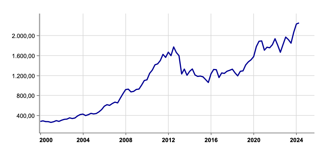 An der Börse bleiben die Risiken fürs Erste ausgeblendet. Die Zinssenkungshoffnungen der Anleger scheinen sich nun endlich zu erfüllen. Wie aber die Reaktionen auf eskalierende Kriegshandlungen ausfallen werden oder auf die Wahlergebnisse in der Festung EU sowie auf den Wahlausgang in der US-Präsidentschaftswahl, bleibt offen. Die Unsicherheiten machen es unwahrscheinlich, dass die politische Börse 2024 kurze Beine hat, wie ein beliebtes Börsen Bonmot lautet. Tektonische Verschiebungen im Parteienspektrum, ein diktatorischer greiser Präsident der Superpower USA und der Übergang von der Friedens- zur Kriegswirtschaft werden für mehr als nur Fussnoten in Studien und Analysen sorgen. Ein klarer Ausdruck dessen sind Höchstpreise für Gold, rapide steigende Preise für Kryptowährungen und gleichzeitig ein starker USD – alles Zeichen der Flucht in sichere Häfen, die sich aber auch erst noch als richtig erweisen müssen. Reale Werte wie Gold und auch sonstige Rohstoffe werden so oder so gebraucht, Gewerbeimmobilien und sonstiges Betongold nach den aktuellen Preisentwicklungen zu urteilen eher nicht
