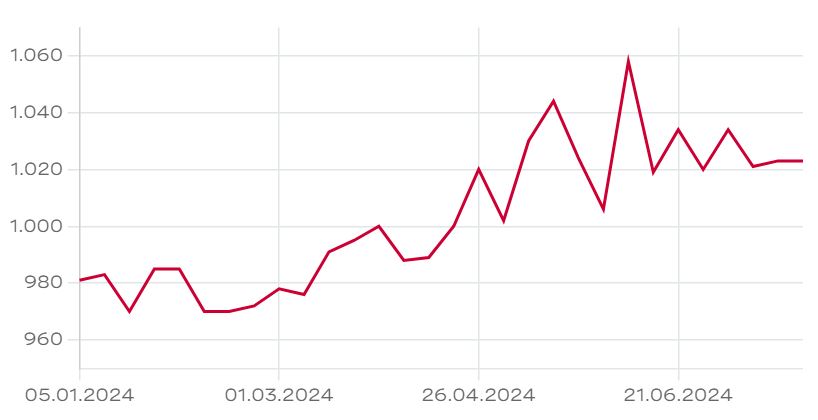 Seit Jahresbeginn hat der Aktienkurs fast 5% zugelegt. Chart: otc-x.chDie Aktien der Regiobank Solothurn werden ausserbörslich auf OTC-X gehandelt. Zuletzt wurden 1’023 CHF für eine Aktie bezahlt. Seit Jahresbeginn hat der Aktienkurs fast 5% zugelegt.