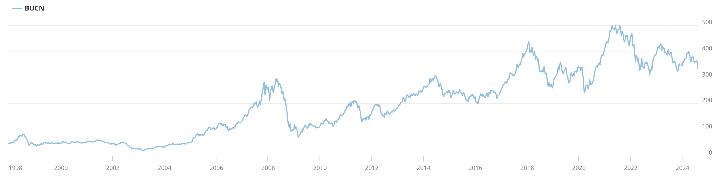 Bei Bucher ist das Aktionariat ähnlich von institutionellen Investoren wie Vanguard, Norges Bank, ZKB und Vontobel geprägt. Und ähnlich wie bei Zehnder hat die Geschäftsdynamik durch die Konjunkturschwäche zuletzt nachgelassen. Im ersten Halbjahr 2024 blieb die Nettogewinnmarge mit 8,4% gegenüber 10,3% in der Vorjahresperiode jedoch auf gutem Niveau. Umsatz, Auftragseingang und Auftragsbestand waren rückläufig. Die Eigenkapitalquote wurde auf 61,9% gesteigert. Wie bei Zehnder ist der Ausblick bei Bucher verhalten, aber nicht pessimistisch. Positive Impulse könnten von wieder steigenden Preisen bei Agrar-Rohstoffen ausgehen, da sich die Landwirtschaft mit neuen Orders zurückgehalten hat. Gut läuft es im Geschäft mit Kommunalmaschinen, wo auch die Margen zulegten. Das ist eine Folge der in den Vorjahren eingeleiteten Massnahmen zur Effizienzsteigerung. Das ist auch das Ziel ähnlicher Massnahmen in den anderen Geschäftseinheiten. Für das Gesamtjahr zeichnet sich ab, dass sowohl Umsatz wie Gewinn unter dem Vorjahr liegen werden. Zu berücksichtigen ist, dass die Vergleichsbasis des starken Jahres 2023 hoch ist. Doch was an der Börse zählt, sind die Perspektiven, nicht der Blick in den Rückspiegel. Der langfristige Chart von Bucher zeigt einen ungebrochenen nach oben gerichteten Trendkanal. Der aktuelle Kurs von 340.50 CHF liegt nahe dem unteren Ende des Trendkanals und mehr als 30% unter dem Hoch von 500 CHF, das zwischen April und Juli 2021 verzeichnet worden war.