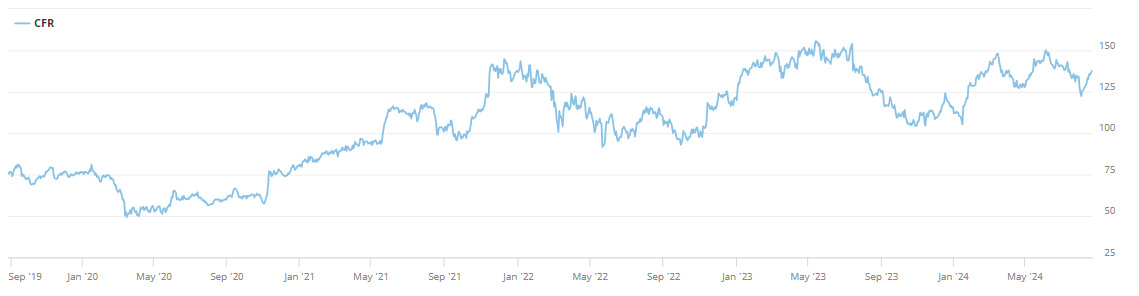 Bis März 2020 war die Entwicklung der Aktie von Kühne+Nagel positiv, wenngleich eher unspektakulär. Dann jedoch hat sich die Aktie innert 18 Monaten fast verdreifacht. Hintergrund waren die Verwerfungen der Lieferketten und an den internationalen Transportmärkten, die zu extrem hohen Frachtraten und Gewinnen führten. Inzwischen hat sich die Lage einigermassen normalisiert. Der Kurs liegt rund 30% unter dem Hoch.