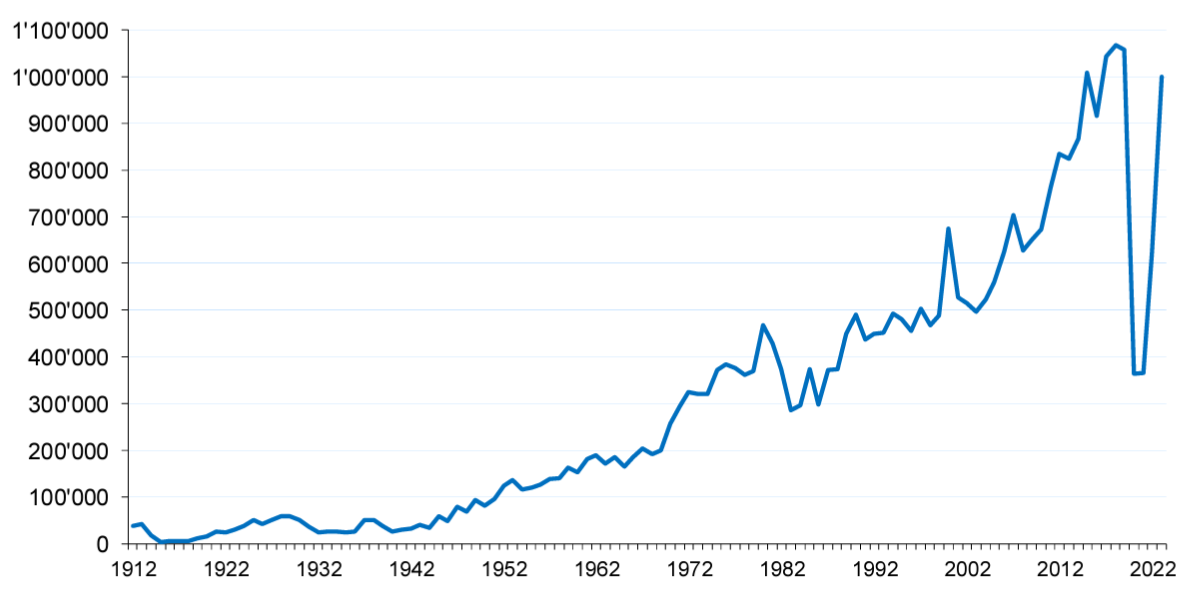 Höher. Schneller. Weiter. Das könnte auch das Motto des Interlakner Tourismusunternehmens sein. Denn mit wenigen Ausnahmen, wie den Pandemiejahren 2020 bis 2022, ging es bei der Jungfraubahn-Gruppe stets aufwärts. Die Besucherzahlen am Jungfraujoch, das weltweit als Top of Europe vermarktet wird, kletterten zeitweise auf über 1 Million. Mit den Gästezahlen stiegen auch die Umsätze der Jungfraubahn-Gruppe an. Eng verbunden ist der Anstieg mit dem Eintritt von Urs Kessler 1987 in das Unternehmen. Er hat erst als Verkaufsleiter die asiatischen Märkte erschlossen und später als CEO den Aufstieg des Unternehmens entscheidend mitgestaltet. Es ist also auch kein Wunder, dass im 1. Halbjahr 2024, dem letzten vollen Geschäftsjahr unter der Leitung des Berner Oberländers, wieder ein Rekordumsatz von 141.8 Mio. CHF vermeldet werden konnte.