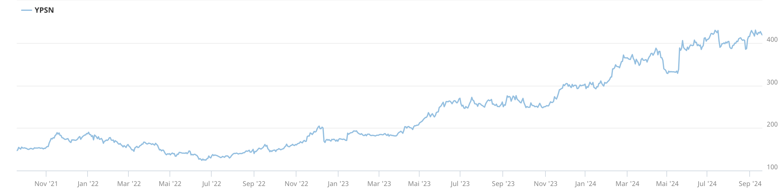 Im Geschäftsjahr 2023/2024 kletterte der um eine Devestition bereinigte Umsatz um 24,5% auf 548.5 Mio. CHF! Die EBIT-Marge stieg um mehr als das Doppelte auf 15,7%, und der Jahresgewinn erhöhte sich um 52,8% auf 78.4 Mio. CHF, was einer Nettogewinnmarge von 14,3% entspricht. Der Ausblick bleibt positiv. Die selbsentwickelte Ypso-Pump wurde zur Zulassung bei der FDA eingereicht. Bis 2025 sollen zwei Unternehmenseinheiten geschaffen werden, die sich ganz auf das B2C- respektive das B2B-Geschäft fokussieren. Wachstumsimpulse schaffen auch neue Indikationsgebiete für die Autoinjektoren wie Migräne, Multiple Sklerose, Onkologie, Dermatitis und Psoriasis. Für das Geschäftsjahr 2024/2025 wird ein Wachstum von 25% und ein EBIT von 140 Mio. CHF erwartet. Das war Grund genug, um die Ypsomed-Aktie Anfang August nach Ausverkauf an den Börsen auf die Liste der Turnaround-Kandidaten zu setzen. Der Kurs stieg seitdem von 380 CHF auf 420 CHF. Der seit September 2022 etablierte Aufwärtstrend ist intakt.