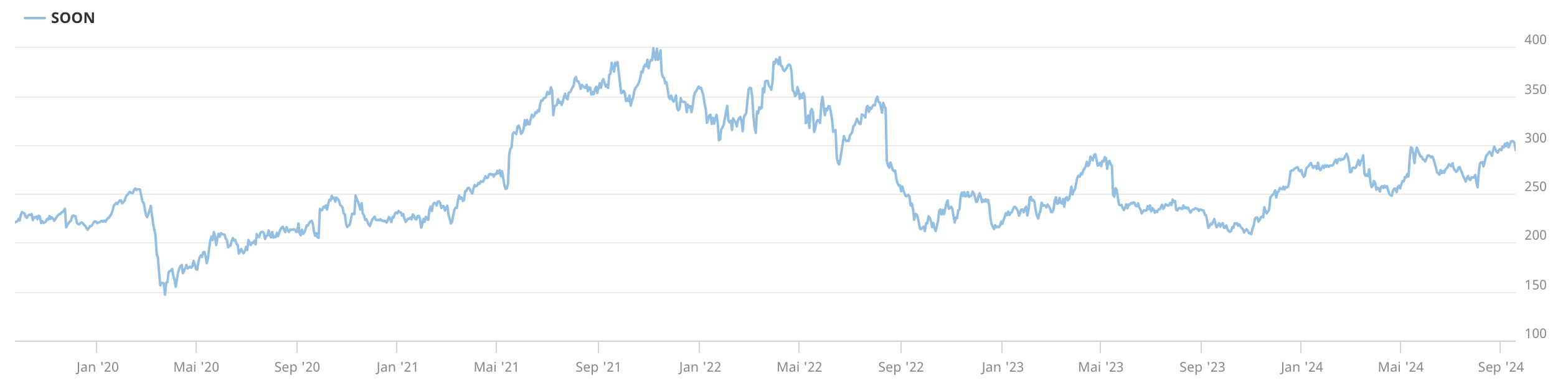Bei Sonova ist der langfristige Aufwärtstrend ungebrochen. Ähnlich wie bei Straumann scheint es jedoch viel Zeit zu erfordern, bis die Korrektur nach der Übertreibungsphase abgeschlossen ist. Nach dem Doppelhoch von Ende 2021 und Mai 2022 halbierte sich der Kurs innerhalb weniger Monate. Noch im Oktober 2023 pendelte der Kurs knapp über 200 CHF, konnte sich jedoch im laufenden Jahr deutlich befestigen. Dazu trugen innovative Produkte bei wie ein Hörgerät, das mit Hilfe von KI Umgebungsgeräusche vermindern kann, sodass die Hörqualität deutlich verbessert wird. Im Geschäftsjahr 2023/2024 per 30. März war der Umsatz um 3% rückläufig. Für das laufende Geschäftsjahr wird von den Analysten ein Zuwachs im hohen einstelligen Prozentbereich prognostiziert. Der Wettbewerb ist hart. Für längerfristige Impulse sorgt die zunehmende Überalterung der Gesellschaft, denn Hördefizite treten vor allem bei Senioren auf. Es bleibt abzuwarten, ob die neuen teureren Produkte für eine nachhaltige Nachfragebelebung sorgen werden.