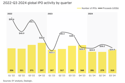 Eine besondere Rolle spielen weiterhin IPOs von Unternehmen aus dem Bereich der Künstlichen Intelligenz. Laut EY sind in den letzten beiden Jahren jeweils 60 IPOs aus diesem Segment erfolgt. Die Hälfte davon verzeichnete soweit eine negative Performance. Gegenwärtig sind rund 50 weitere KI-IPOs im Registrierungsprozess, wovon ein Drittel profitabel sein soll.