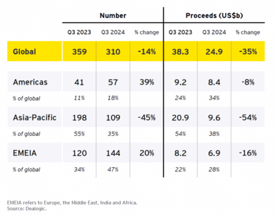 Insgesamt sind in den ersten drei Quartalen 62 nicht-amerikanische Unternehmen an die US-Börsen gegangen; in der Vorjahresperiode waren es noch 48. Umgekehrt gingen 54 Unternehmen aus der asiatisch-pazifischen Region in anderen Ländern an die Börse, nach 45 im Vorjahreszeitraum. Die KGVs an den US-Börsen liegen bei über 20x, in China bei 12x und in Hongkong bei unter 10x. An den europäischen Börsen liegen die Markt-KGVs meist bei etwa 15x. Weiterhin hebt EY hervor, dass Spin-offs und Equity Carve-outs sowie Börsengänge von Private-Equity-finanzierten Unternehmen das Marktgeschehen dominieren. Ein Beispiel hierfür ist der angekündigte Spin-off von Sunrise. Erst vor vier Jahren war das Telekom-Unternehmen von Liberty Global von der Börse genommen worden.