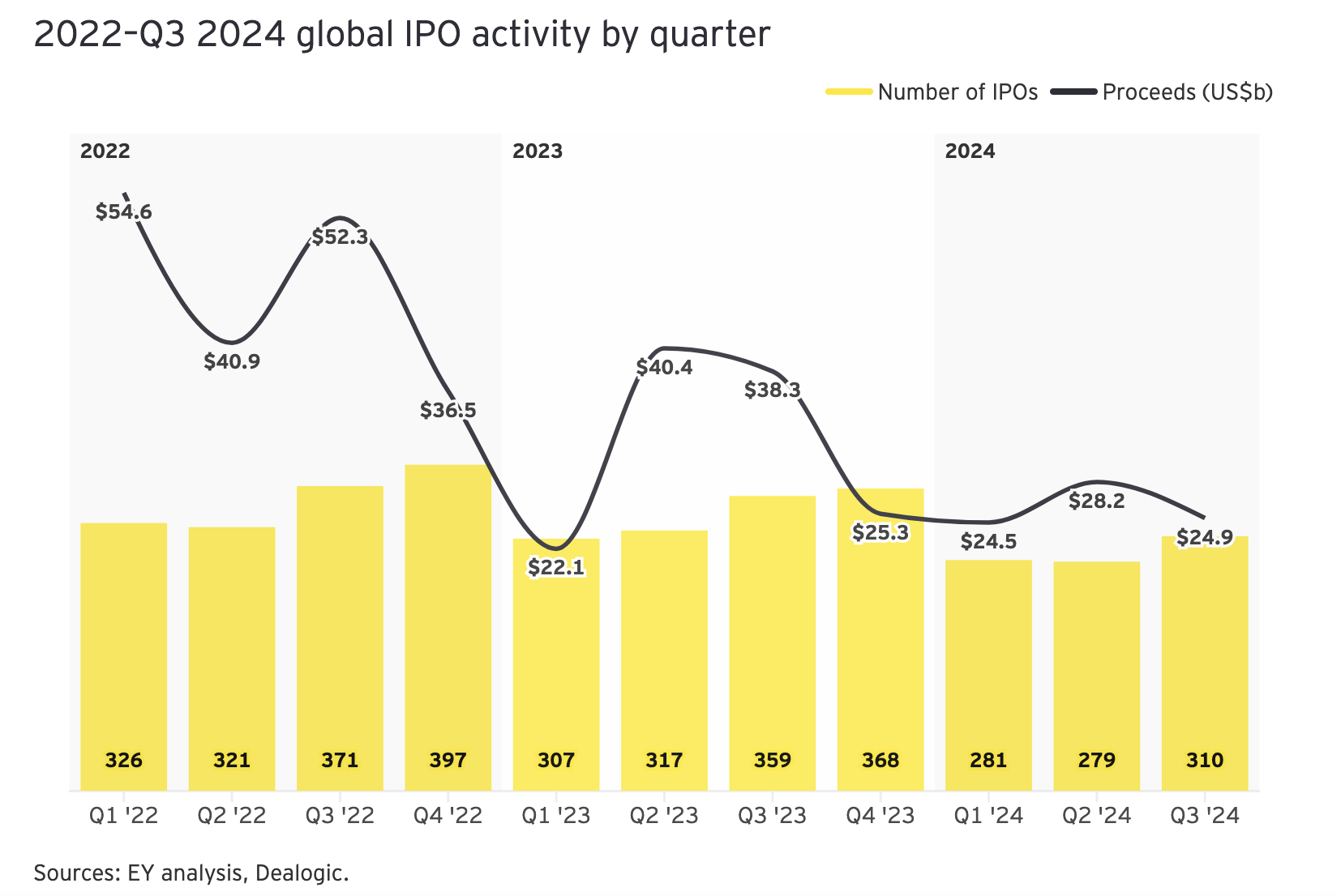 In der Schweiz fand das letzte IPO im März des Jahres statt. Obwohl Galderma den Erstzeichnern stattliche Gewinne bescherte, mangelte es im zweiten und dritten Quartal an Nachfolgern. In Deutschland ist die Lage gleich: Kein einziger Börsengang in den letzten zwei Quartalen. Anfang Jahr waren die Erwartungen hoch, doch tatsächlich schoben 14 der 15 von der SIX genannten IPO-Kandidaten in der Pipeline den Börsengang auf. Gründe lassen sich viele finden. Die Verschlechterung der geopolitischen Lage durch die immer weiter eskalierenden militärischen Konflikte in der Ukraine und im Nahen Osten, die für November anstehenden Präsidentschaftswahlen in den USA mit unsicherem Ausgang sowie die rezessiven Tendenzen, vor allem in Europa.