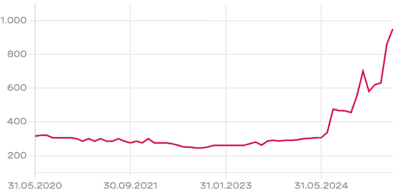 Die Aktie der Kursaal Interlaken Holding AG ist auf OTC-X gelistet und kostete zuletzt 1’000 CHF. Seit Mitte letzten Jahres ist der Aktienkurs bei hohen Volumen kräftig angestiegen, was angesichts des negativen Jahresabschlusses doch überrascht. Gründe für den Anstieg wurden im Geschäftsbericht nicht kommuniziert. Der ausgewiesene Buchwert lag per Ende 2024 bei 1’246 CHF je Aktie.