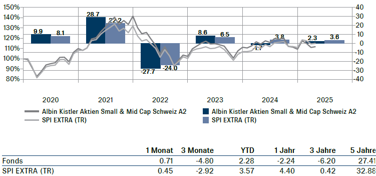 Der Albin Kistler Aktien Small & Mid Cap Schweiz verfolgt das Ziel, den SPI Extra Index (SPIEX) über einen ganzen Börsenzyklus hinweg zu übertreffen. Der Fonds wurde 2016 aufgelegt, investiert aktiv und mit langem Anlagehorizont. Im Unterschied zu vielen Anlagefonds werden die Investitionsentscheide im Team gefällt. Das 4-köpfige SMC-Anlagegremium wird dabei von insgesamt 20 Analysten unterstützt. Das Fondsvolumen liegt derzeit bei etwa 45 Mio. CHF.