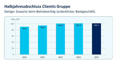 Die Clientis Gruppe hat im ersten Halbjahr 2025 ein stabiles Ergebnis erzielt und zeigt sich weiterhin robust und wachstumsorientiert. Trotz anspruchsvollem Zinsumfeld lag der Gruppengewinn mit 31.4 Mio. CHF nur leicht unter dem Vorjahr (-1,8%).