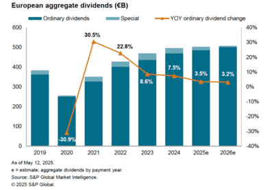 Der Blick auf die weitere Dividendenentwicklung in Europa sieht durchaus anders aus als in anderen Regionen. Die europäischen Banken haben ihre Dividenden 2023 um 28,5% und 2024 um 30,4% angehoben. Für 2025 erwartet S&P Global Intelligence eine Steigerung um nochmals 9,6%, für 2026 wird jedoch infolge der Zinssenkungen eine Stagnation prognostiziert. Weiterhin positiv fallen die Prognosen für Luftfahrt und Verteidigung mit einem Dividendensanstieg um 36,4% in 2025 und 12,1% in 2026 aus. Ebenfalls positiv ist die Dividendenprognose für die europäische Pharmaindustrie mit 5% Zuwachs in 2025 und 9% in 2026. Am anderen Ende des Spektrums findet sich die Automobilindustrie, deren Dividendensumme 2025 um 27% kollabiert und 2026 um weitere 11,4% tiefer erwartet wird. Hauptgründe sind die US-Zollpolitik sowie der verschärfte Wettbewerb.
