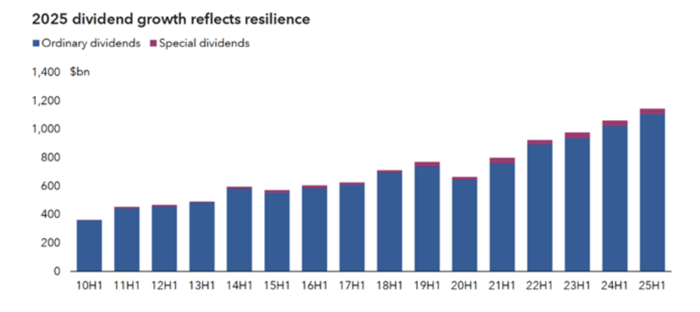 Laut der Capital Group nahm die globale Ausschüttungssumme im ersten Halbjahr um 7,7% auf 1.14 Billionen USD zu. Bereinigt um Sondereffekte und Wechselkursveränderungen lag der Zuwachs bei 6,2%. Rekordwerte wurden in den USA, Kanada, Japan, mehreren europäischen Ländern und Emerging Markets verzeichnet. In Japan stieg die Ausschüttungssumme um 13,8% auf 54.9 Mrd. USD, in der Schweiz um 4,5% auf 46.2 Mrd. USD. Dazu trug der in der Schweiz stark vertretene Finanzsektor wesentlich bei, der die Ausschüttungssumme global um 9,2% auf 299 Mrd. USD erhöhte. Banken und Versicherungen waren somit der grösste Wachstumstreiber und steuerten 40% zum aggregierten globalen Dividendenwachstum bei. Ebenfalls starke Anhebungen der Ausschüttung lieferten die Sektoren Luft- und Raumfahrt, Verteidigung, Transport und Software. Deutlich schwächer entwickelte sich der Automobilsektor, weshalb die Dividenden in Europa insgesamt nur unterdurchschnittlich stiegen. 86% der Unternehmen erhöhten die Dividende oder hielten sie stabil. Das mittlere Kernwachstum der Ausschüttungshöhe ermittelte die Capital Group bei 6,1%.