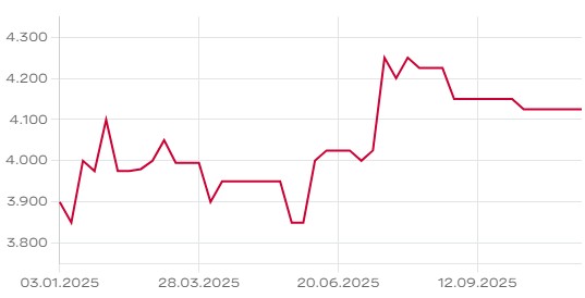 Die Aktien der Plaston Holding AG werden ausserbörslich auf OTC-X gehandelt. Zuletzt wurden 4’150 CHF für eine Aktie bezahlt. Nach der Rückkehr in die Gewinnzone und der Wiederaufnahme der Dividendenzahlung für das Geschäftsjahr 2024/25 hat sich der Aktienkurs seit Jahresbeginn erholt.
