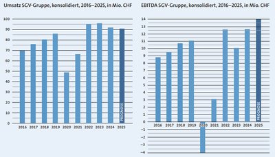 Mit einer operativen EBITDA-Marge von 15% erwartet das Unternehmen auf Gruppenebene ein Rekordergebnis. Für den Konzern rechnet die SGV 2025 mit einem konsolidierten Betriebsertrag von rund 91 Mio. CHF und einem Betriebsergebnis (EBITDA) von rund 14 Mio. CHF, was einen markanten Anstieg gegenüber den Vorjahren bedeutet. Das übertreffe die Erwartungen und bestätige die starke Performance auf Konzernstufe, schreibt die SGV.