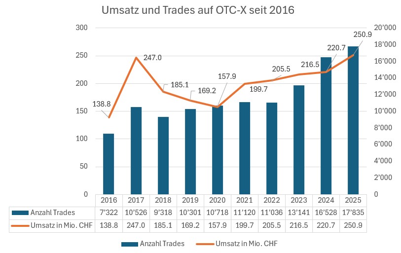 Seither ist die Anzahl der Abschlüsse auf OTC-X zwar kontinuierlich gestiegen und bewegte sich meist oberhalb der 10’000er-Grenze. Den Rekordwert beim Umsatz aus dem Jahr 2017 konnte OTC-X bisher jedoch nicht übertreffen. Mitte Dezember 2025 egalisierte der Umsatz nun nicht nur die frühere Rekordmarke, sondern übertraf auch die 250-Mio.-CHF-Grenze. Im Gegensatz zu 2017 gibt es in diesem Jahr keinen Titel, der allein für diesen Umsatzanstieg verantwortlich ist. Ein Blick auf die Kurslisten zeigt zwar, dass einzelne Titel wie WIR Bank (29.8 Mio. CHF), WWZ (17.8 Mio. CHF) und Bobst (17.2 Mio. CHF) zu den sehr hohen Umsätzen einen wichtigen Beitrag geleistet haben. Allerdings waren die Umsätze bei Bobst im Jahr 2023 mit über 30 Mio. CHF wesentlich höher. Auch die Umsätze mit Aktien des Bündner Energieunternehmens Repower liegen 2025 deutlich unter den früheren Höchstwerten. Insgesamt kann der Umsatzanstieg daher als «breit abgestützt» bezeichnet werden.