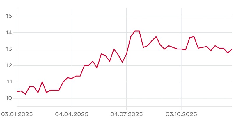 Der Aktienkurs der Rigi Bahnen AG hat in diesem Jahr um über 25% zugelegt. Chart: otc-x.chDie Aktien der Rigi Bahnen AG werden ausserbörslich auf OTC-X gehandelt. Zuletzt wurden 13 CHF für eine Aktie bezahlt. Zwischenzeitlich stieg der Kurs sogar auf 14 CHF.