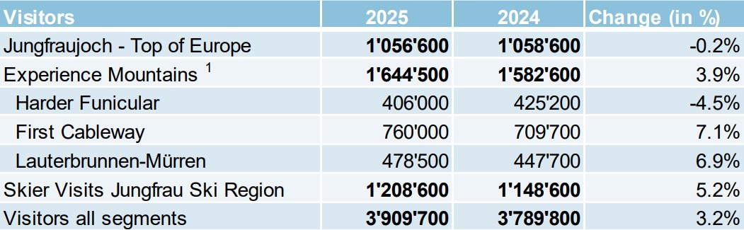 Mit den Frequenzen im abgelaufenen Geschäftsjahr ist Hammel zufrieden, auch wenn die Besucherzahlen auf dem Jungfraujoch im 2. Halbjahr gegenüber der vergleichbaren Vorjahresperiode zurückgegangen sind (siehe Grafik): Statt 598’000 Gästen transportierte die Jungfraubahn «nur» noch 584’000 Gäste auf das Joch (-2,3%). Auch der Harder kam an seine Grenzen. Auffällig ist im Vergleich zur Zeit vor Corona, dass die Anzahl der Individualreisenden deutlich zugenommen hat. 2019 lag der Anteil Gruppenreisender auf dem Jungfraujoch noch bei 70%, im Jahr 2025 werden es nur noch rund 43% sein. Gäste aus China sind wieder die grösste Gästegruppe, gefolgt von Besuchern aus Südkorea und Indien. Für das laufende Jahr sieht Oliver Hammel, der erst kürzlich in Asien auf Verkaufsreise war, trotz der geopolitischen Unsicherheiten und des starken Frankens positive Signale. Auch sollen moderate Preiserhöhungen vorgenommen und an der Effizienz weiter gearbeitet werden. Zudem war der Start in der Wintersaison 2025/26 der beste seit Bestehen des Unternehmens. Auf der Kostenseite dürften die Personalkosten – nach einem Anstieg in den vergangenen Jahren aufgrund der Inflation und des personellen Ausbaus – stabil bleiben. Auch bei den Energiekosten erwartet Finanzchef Christoph Seiler eine Entlastung.