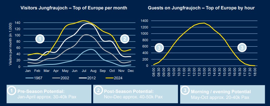 Gleichzeitig zur Bekanntgabe der neuen Finanzziele erläuterte Hammel an einem Investorentag in Grindelwald die strategischen Weichenstellungen, die er in den kommenden Jahren vornehmen möchte. «Ich bin nicht angetreten, um alles zu ändern», so Hammel vor den Investoren. Vielmehr habe er ein gut geführtes, hochprofitables Unternehmen mit einem hervorragenden Team vorgefunden. Dennoch sieht er an mehreren Stellen Ansätze zur Optimierung. «From volume to value», ist einer der Leitsätze, nach denen Hammel künftig arbeiten möchte. Dies bedeutet nicht, dass das Jungfraujoch seine Wachstumsgrenzen erreicht hat. Vielmehr machte Hammel – wie bereits sein Vorgänger Urs Kessler – deutlich, dass das «Top of Europe» in den Frühlings- und Herbstmonaten durchaus noch Kapazitäten hat. 365 Tage Hochsaison bleiben daher weiter das Ziel der Jungfraubahnen. Ebenso gibt es in Tagesrandzeiten noch genügend Platz für Reisende, der gefüllt werden kann.