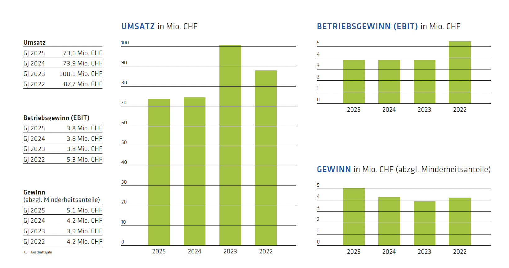 Entscheidend für die positive Gewinnentwicklung sind die um 3.2 Mio. CHF reduzierten Aufwände für Material und Vorleistungen Dritter. Mit 51 Mio. CHF ist es der grösste Aufwandsposten, gefolgt von Personalkosten, die mit 9.2 Mio. CHF um 0.6 Mio. CHF höher ausfallen. Bei einem um 2.6 Mio. CHF reduzierten gesamtbetrieblichen Aufwand von 63.3 Mio. CHF errechnet sich ein EBITDA-Ergebnis von 10.4 Mio. CHF. Der Vorjahreswert lag bei 7.9 Mio. CHF. Höhere Abschreibungen auf Sach- und Finanzanlagen führten zu einem fast unveränderten EBIT in Höhe von 3.8 Mio. CHF. Ein etwas höheres Finanzergebnis von 1.2 Mio. CHF sowie ein ausserordentlicher Ertrag von 0.8 Mio. CHF führten bei einer geringfügig höheren Steuerlast von 0.6 Mio. CHF zum rekordhohen Gewinn von 5.2 Mio. CHF, respektive 5.1 Mio. CHF nach Minderheiten. Der Vorjahreswert lag noch bei 4.2 Mio. CHF.