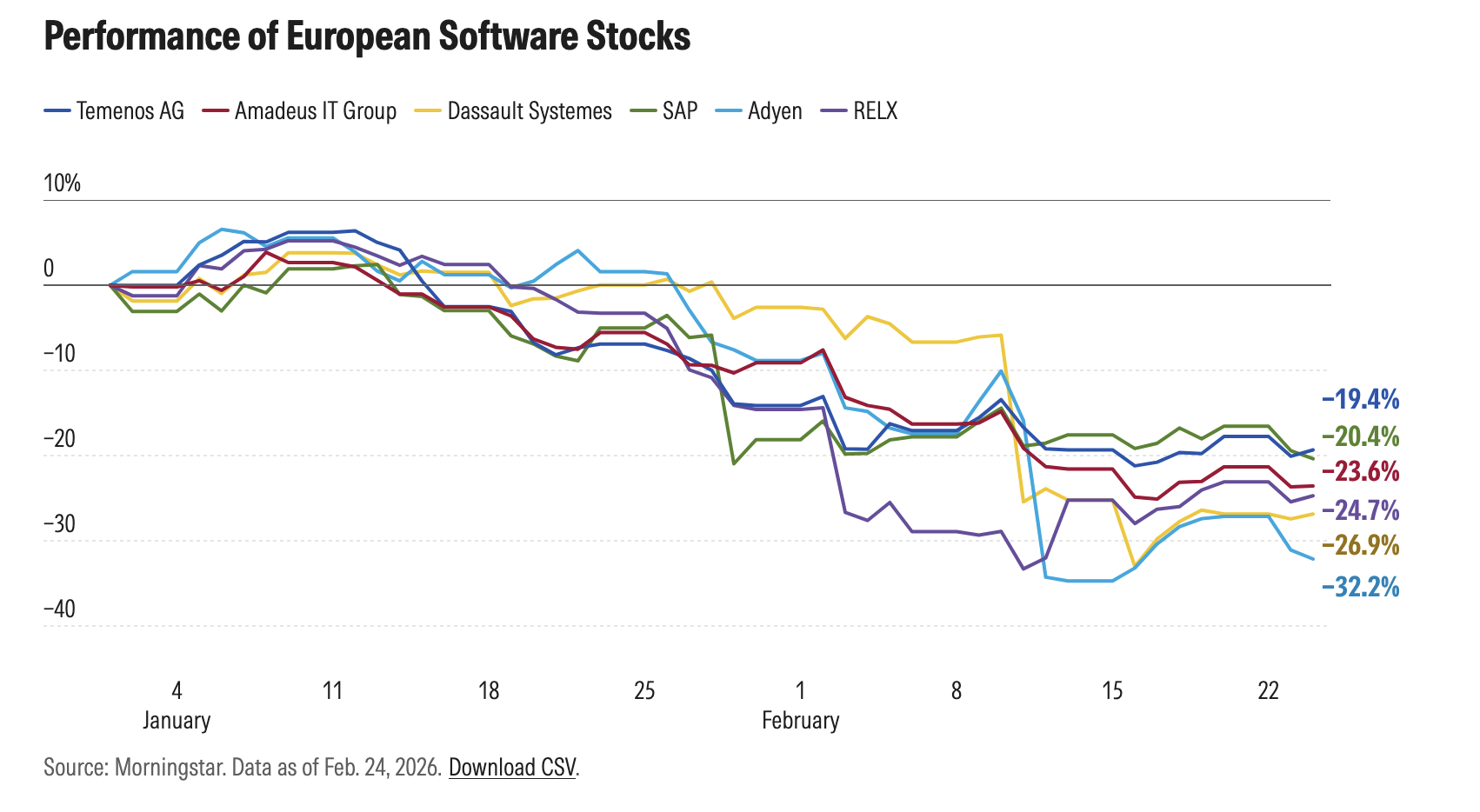 Europäische Software-Aktien inkl. Temenos. Grafik: morningstar. comNervosität und Volatilität