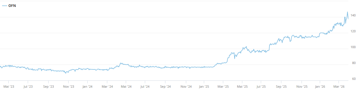 Die Aktie (OFN, SIX Swiss Exchange, ISIN CH0003420806) reagierte auf die Zahlenveröffentlichung mit einem Kursanstieg auf 146 CHF, dem höchsten Stand der letzten 52 Wochen. Aktuell notiert der Titel bei 141.50 CHF (Stand 27. März 2026), was seit dem Jahrestief von 84.20 CHF im April 2025 einer Jahresperformance von rund 68% entspricht. Der Verwaltungsrat beantragt eine Dividende von 5.80 CHF je Aktie, eine Erhöhung um 32% gegenüber dem Vorjahr (4.40 CHF). Die Dividende ist zahlbar am 27. Mai 2026 (Ex-Datum 22. Mai) und entspricht auf aktuellem Kursniveau einer Rendite von 4.1%. Das KGV liegt bei rund 15 auf Basis des Reingewinns nach Minderheiten, das KUV bei 1.0. Im Aktionariat dominiert die SNB mit 33.3%, gefolgt von Dieter Meier (15%) und der Familie Theo Siegert (9.9%).